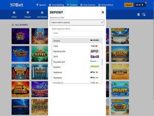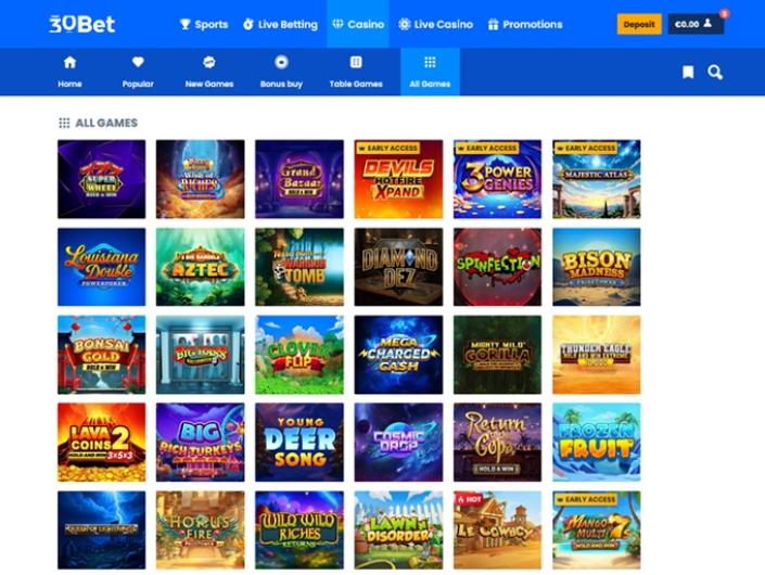 Das Herzstück des Casino-Erlebnisses sind Slots, Tischspiele und Live-Dealer-Spiele, und das 30Bet.com Casino ist stolz darauf, diese Spiele zu seinem Kernangebot zu machen. Dieser unglaubliche Umfang wird durch führende Software Entwickler wie BetSoft, Quickspin und viele andere ermöglicht, die alle prominent in der Spiele-Lobby vertreten sind.
