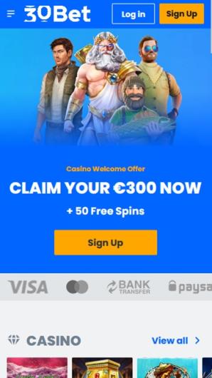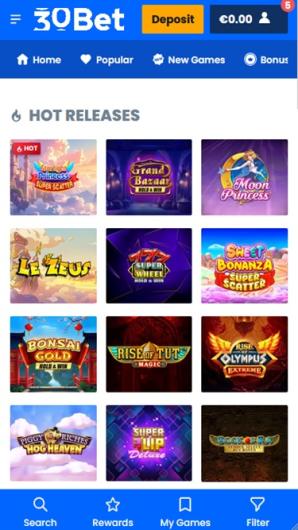 Das Layout ist Standard und es ist einfach, sich auf der Website zurechtzufinden. Was im Vergleich zu anderen Online Casinos anders ist, sind die gewählten Farben. Das 30Bet.com Casino hat sich für helle Farben entschieden und nicht für einen dunklen Hintergrund. Die vorherrschende Farbe ist Weiß und sie wird durch lebendige Bilder und Symbole ergänzt. Es gibt kein Menü, aber die Shortcuts sind in einer Reihe am oberen Rand der Seite angeordnet und am unteren Rand sehen die Besucher die restlichen Optionen.