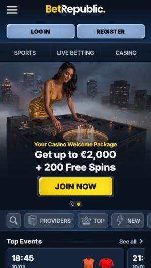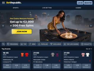 Das erste, was über das BetRepublic-Sportwettenangebot zu sagen ist, ist, dass das Casino und das Sportwettenangebot in dieselbe Website integriert sind, sodass es einfach ist, von einem Bereich zum anderen zu wechseln. In der linken Ecke siehst du die Registerkarten Sport und Casino. Wenn du also Sportwetten platzieren möchtest, ist der Weg dorthin ganz klar.