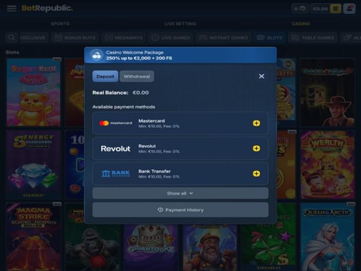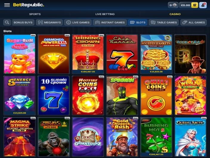 Eine der stärksten Waffen, die BetRepublic einsetzt, um der Konkurrenz voraus zu sein, ist seine beeindruckende Spielothek. Das konntest du schon an unserem früheren Kommentar erkennen, dass die Seite ein wenig chaotisch wirkt, und dieses Chaos kommt vor allem von der schieren Menge an Spielen, die über verschiedene Kategorien verteilt sind. Und wenn wir von Kategorien sprechen, meinen wir damit, dass die Homepage weit über Slots hinausgeht, auch wenn Slots immer noch das beliebteste Format in fast jedem Online Casino sind und in allen möglichen Formaten angeboten werden. Hier umfasst die Auswahl auch Live Spiele, Crash Spiele, Tischspiele, Jackpots, Spielshows, Baccarat, Würfelspiele, Poker und mehr.