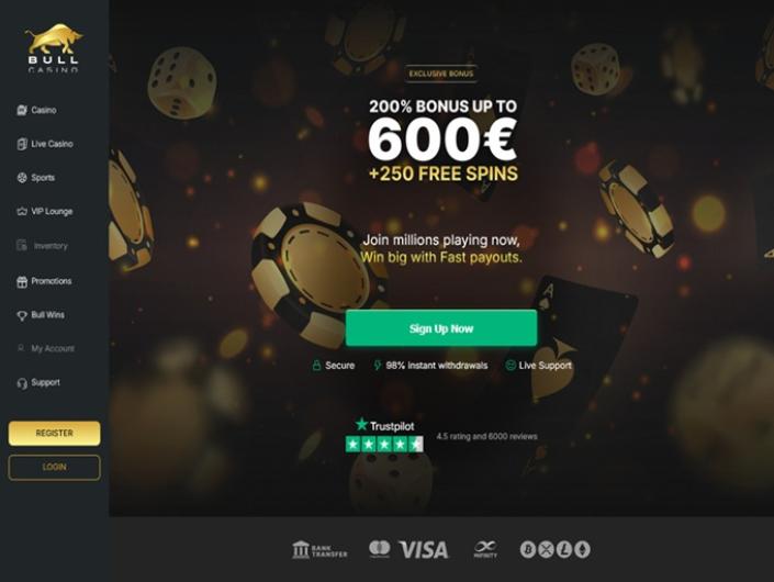 Bull Casino ist auf Rang 423 von 684 Casinos auf LCB insgesamt und hat eine durchschnittliche Bewertung von 2.7 bei 9 abgegebenen Stimmen. Im Angebot finden sich 3215 Spielautomaten von BetSoft, Evolution Gaming, Greentube und 43 andere, die nach 89245 Stimmen durchschnittlich eine Bewertung von 4.0 erhalten haben.