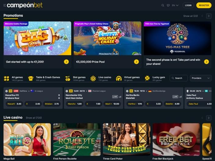 Campeonbet Casino ist auf Rang 212 von 683 Casinos auf LCB insgesamt und hat eine durchschnittliche Bewertung von 3 bei 136 abgegebenen Stimmen. Im Angebot finden sich 5724 Spielautomaten von 1x2gaming, Amatic Industries, Ash Gaming und 114 andere, die nach 160887 Stimmen durchschnittlich eine Bewertung von 3.9 erhalten haben.