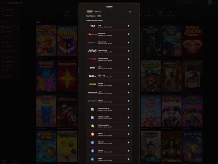 Der größte Vorteil von CrownPlay sind die Zahlungsmöglichkeiten. Die Seite verfügt über eine hervorragende Finanzinfrastruktur mit über 40 Zahlungsmethoden. Spielerinnen und Spieler aus der ganzen Welt können mit Kredit-/Debitkarten, E-Wallets, Banküberweisungen und Kryptowährungen schnell und problemlos ein- und auszahlen. Einzahlungen erfolgen sofort und Auszahlungen über E-Wallets und Kryptowährungen werden sehr schnell bearbeitet.