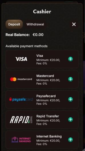 Banking services BLIK, CashtoCode, Interac, Jeton, MiFinity, Neosurf, NETELLER, Nordea, Pay4Fun, Paysafecard, Pix, Postepay, Rapid Transfer, Safetypay, Siru Mobile, Skrill, STICPAY und Zimpler sind nicht verfügbar für Spieler aus Ohio