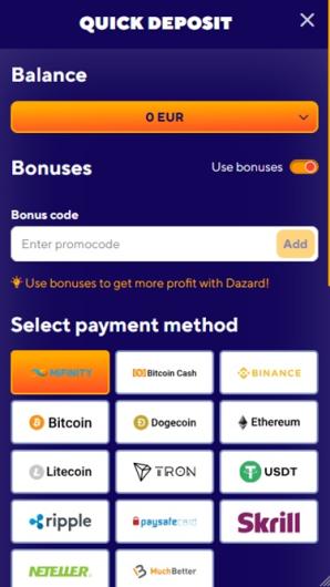 ...denn diese sind sicherlich einer der Gründe ist, warum du Dazard mögen wirst. Saftige Aufstockungen für neu registrierte Spieler helfen dir bei den ersten Schritten am Anfang der Spielsession. Freispielboni Ersteinzahlungsboni... klingt alles nicht schlecht, oder?
