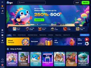 Stell dir also eine freundliche Seite in Blautönen vor. Und unser Fisch, obwohl er im echten Leben bekanntlich tödlich ist, sieht hier wie das genaue Gegenteil aus: nett, lächelnd und ehrlich gesagt so, als würde er den Job genießen. Eine seiner ersten Aufgaben auf der Plattform ist es, ein großes Willkommensangebot zu bewerben, aber dazu kommen wir etwas später. Die Plattform selbst ist vollgepackt mit Details und animierten Elementen, was man heutzutage nicht mehr so oft sieht. Die meisten Casinos und Sportwetten-Anbieter setzen stark auf Minimalismus, aber Fugu setzt auf einen lebhafteren, farbenfroheren Stil. Insgesamt ist es eine ansprechende Plattform mit einem klaren Ozean-inspirierten Theme.