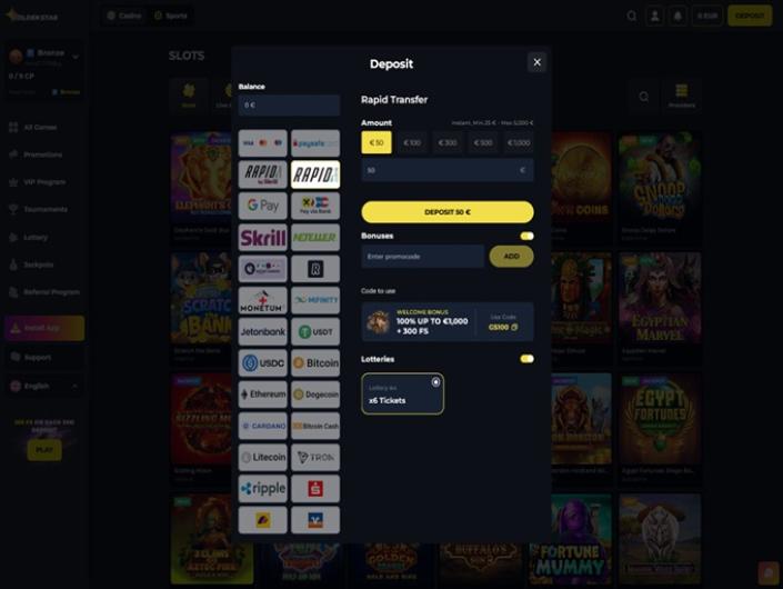 Hinweis: Um den Bonus für die ersten Einzahlungen zu erhalten, muss man vor der ersten Einzahlung den Code GS100 verwenden. Vor der zweiten lautet der Code GS75 und bei der dritten Einzahlung dann GS50.