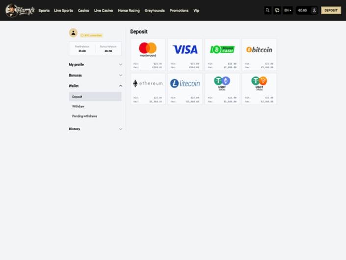 Im Harry's Casino kannst du mit den gängigen Zahlungsmethoden schnell und problemlos ein- und auszahlen. Dazu gehören Karten, Kryptowährungen und Banküberweisungen. Letztere ist nur für Abhebungen verfügbar. Einzahlungen und Abhebungen werden relativ schnell bearbeitet, vor allem bei Kryptowährungen.