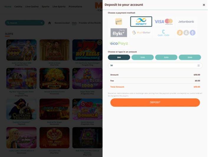 Im Menü des Casinos, das auf der linken Seite deines Bildschirms angezeigt wird, findest du alle Tabs, in denen die Inhalte zu finden sind. Hinter dem imposanten Banner befindet sich die farbenfrohe Spielothek mit vielen Titeln, die die etwas eintönige Atmosphäre der Seite auflockern, während du in der Fußzeile der Seite alle wichtigen Informationen über das Casino findest.