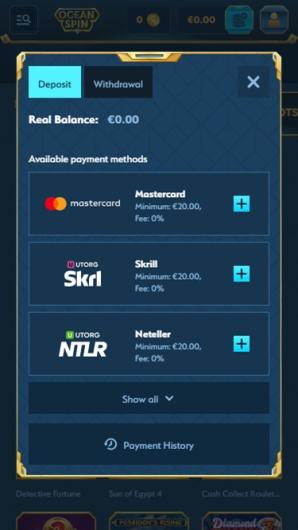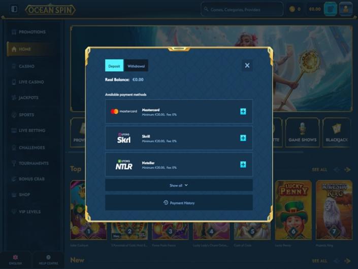Vielleicht möchten einige Spieler die Währung ihres Landes verwenden, während andere bei beliebten Kryptowährungen wie Bitcoin, Tether und Dogecoin bleiben. Egal, auf welcher Seite du stehst, du kannst sicher sein, dass es im OceanSpin Casino Platz für dich gibt. Darüber hinaus gibt es bei den Transaktionsmethoden Überweisungen, E-Wallets wie Skrill, Neteller, gängige Kreditkarten und weitere bequeme Möglichkeiten. Schnelle und sichere Transaktionen haben hohe Priorität und diese Marke hält sich an die Branchenstandards.
