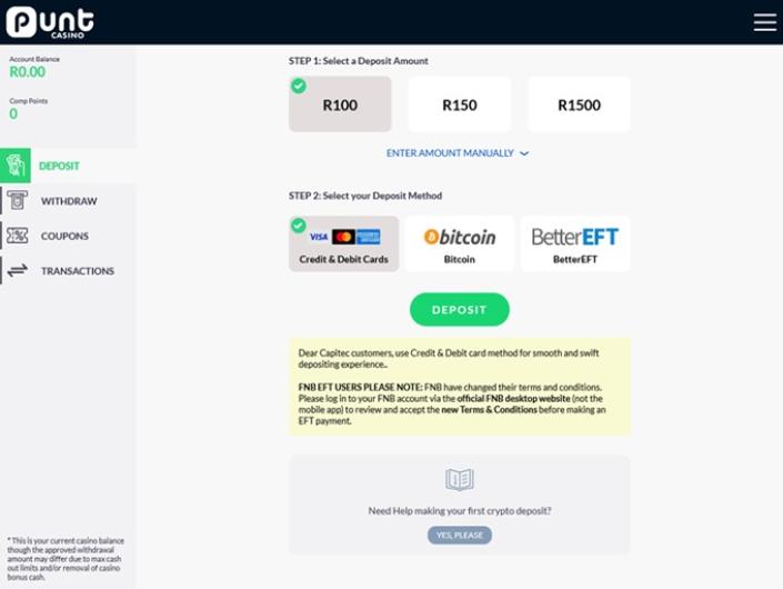 I registred at punt casino mid last year to take advantage of the free R100 no deposit bonus they were offering and although was not at all lucky with the bonus I have found myself making a couple of deposits at this casino since then , mainly for the very low deposit limits which sit at only R25 minimum deposit , The casino is well laid out and support are very friendly and helpful , Its owned by the same guys who own Yebo casino , I am yet to request a withdrawal from them though so I cannot comment on the payout speed but according to support it can take up to five working days which is terrible in my opinion and something they should look at speeding up , aside from that its a typical RTG casino with all the slots and games the software provider offers both on the download version or Instant play desktop version , the casino also hosts a mobile site, the bonus offers are very generous with offers available weekly along with a cashback bonus on losses along with a comp point system which can be redeemed for cash based on your wagering