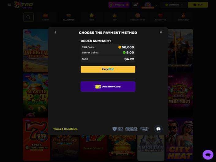 Nach dem offiziellen Beitritt zu dieser Unterhaltungsplattform erhalten neue Spieler einen großzügigen Bonus, der Tao Coins und Secret Coins umfasst. Ein Spieler kann den Spielmodus wechseln, indem er einfach den Schieberegler nach oben oder unten bewegt, je nachdem, welche Coins er verwenden möchte.