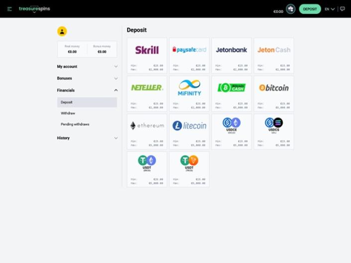 Das Treasure Spins Casino auf dem Handy ist identisch mit dem auf dem Desktop/Lapto. Das betrifft das gesamte Programm: Das einfach zu navigierende Design lädt zum sofortigen Spielen ein. Es werden keine Apps benötigt. Starte das Casino über den Browser deines Geräts. Wische, tippe und zack sind die Spiele geladen. Du kannst jederzeit und überall genau da weiterspielen, wo du aufgehört hast. Logge dich einfach in dein Konto ein (oder registriere dich).