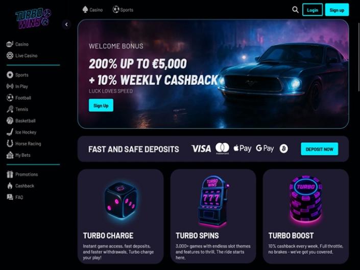 Diese Casino Website verfügt über ein standardmäßiges, benutzerfreundliches Aussehen mit einem dunklen Hintergrund und mehreren neonartigen Details, wie Schaltflächen, Buchstaben und einem riesigen Banner am oberen Rand des Startbildschirms, das einen Rennwagen zeigt, der mit dem Titel der Website verbunden ist, zumindest mit dem Wort „Turbo“ darin.