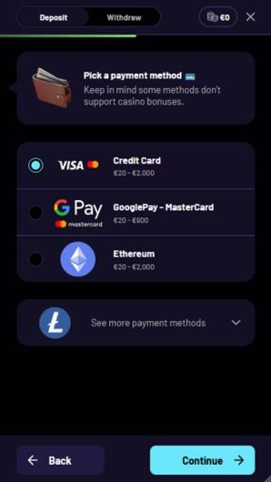 - Es kann sein, dass dir nicht immer alle Einzahlungsmethoden zur Verfügung stehen. Die Website garantiert nicht die Verfügbarkeit einer bestimmten Einzahlungs- und/oder Zahlungsmethode und es steht ihr frei, nach eigenem Ermessen jederzeit Einzahlungsoptionen hinzuzufügen, zu entfernen, zu ergänzen und/oder zu ändern.