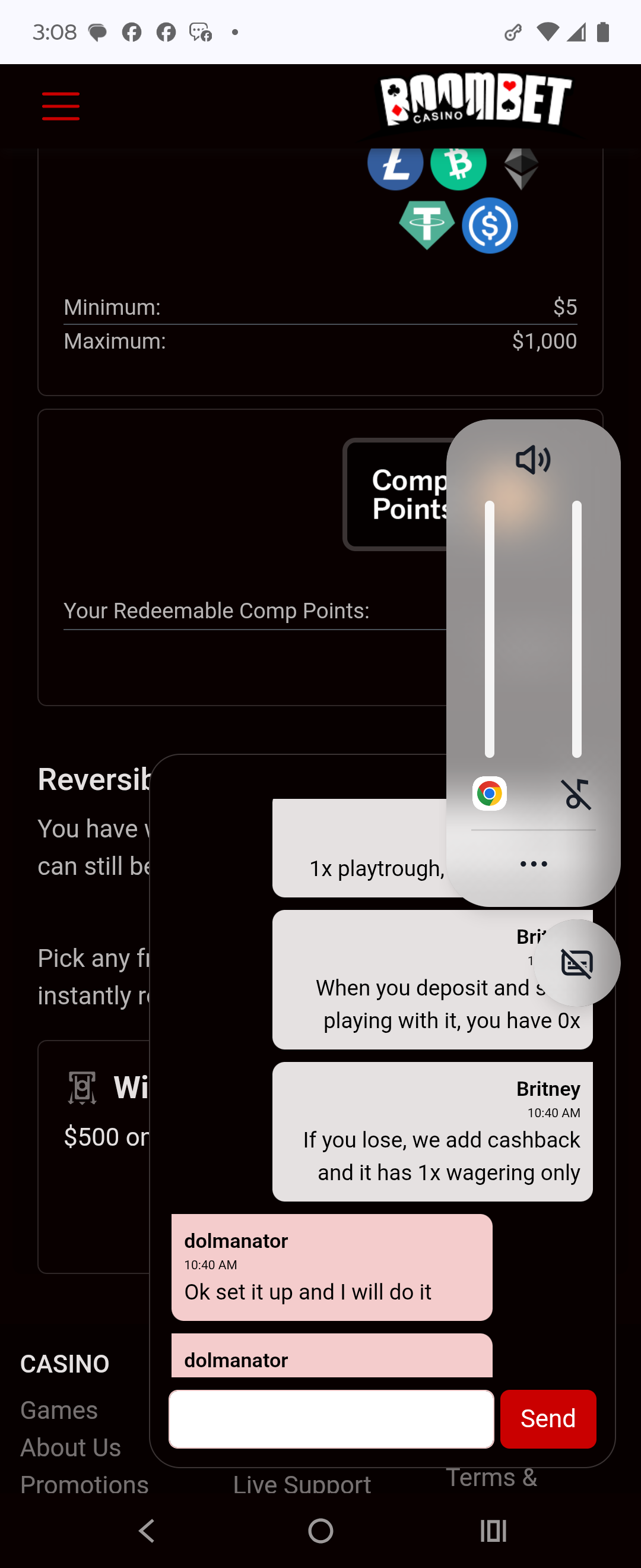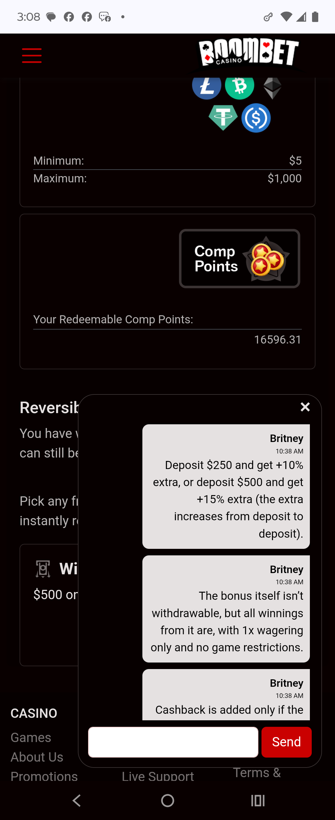 Before I deposited $250 at boombet I was told by support there was 0x playthrough on my deposit, no max cash out and 100% cash back if I lose. I was also told there was no game restrictions. So I made the minimum deposit of $250. After playing for a while I had a $1300 balance and decided to make a withdraw. In the cashier it says the withdraw limit is $500 for whatever option they give you. I was told there was no max withdraw. I contacted support and told them this and I was told since it was the weekend it would take 48 hrs to get a response from a manager regarding me trying to withdraw my winnings. So I figured I would try and at least get the $500 withdraw via bitcoin. It has been pending for almost 24 hrs. I contacted support again and was told a request has been put in to be contacted. I still have not been contacted. Support also told me that boombet doesn't have a max withdraw but that Rival does and that a manager will have to help me with my withdraw request yet no one is contacting me. I thought Bitcoin was supposed to process withdraws quickly? Boombet took my deposit quickly. Also I noticed there is a $2000 limit on Bitcoin deposits yet only $500 on withdraws. Makes no sense. Never had a problem like this in over 10 years of gambling online. Seems like boombet wins even if a player wins. I would think if the casino cared about its players they would contact a player who has won pretty dang quick to get them paid!
