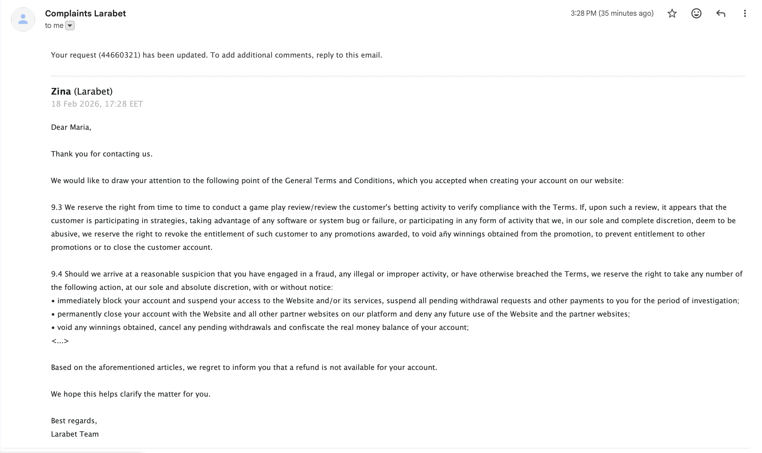 In their email, Larabet quoted general Terms clauses (9.3 / 9.4) and stated that a “refund is not available,” but they did not provide a case-specific explanation for: