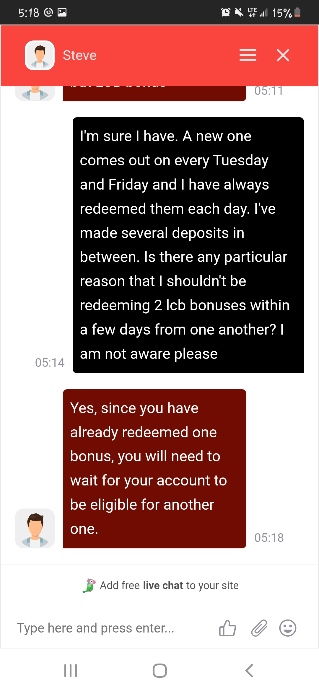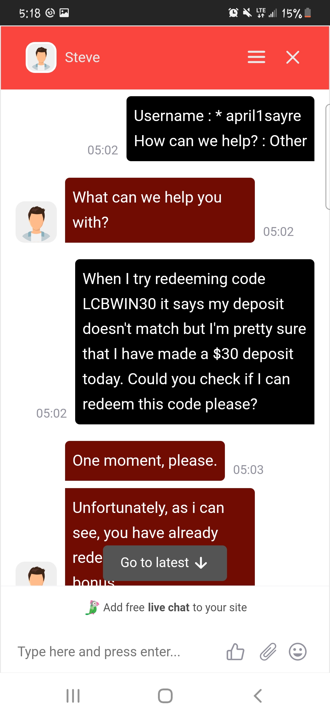 I tried redeeming bonus and it said my deposit didn't match. I have deposited over $30 today. I contacted support and was told that I couldn't redeem 2 LCB bonuses within a few days from one another.