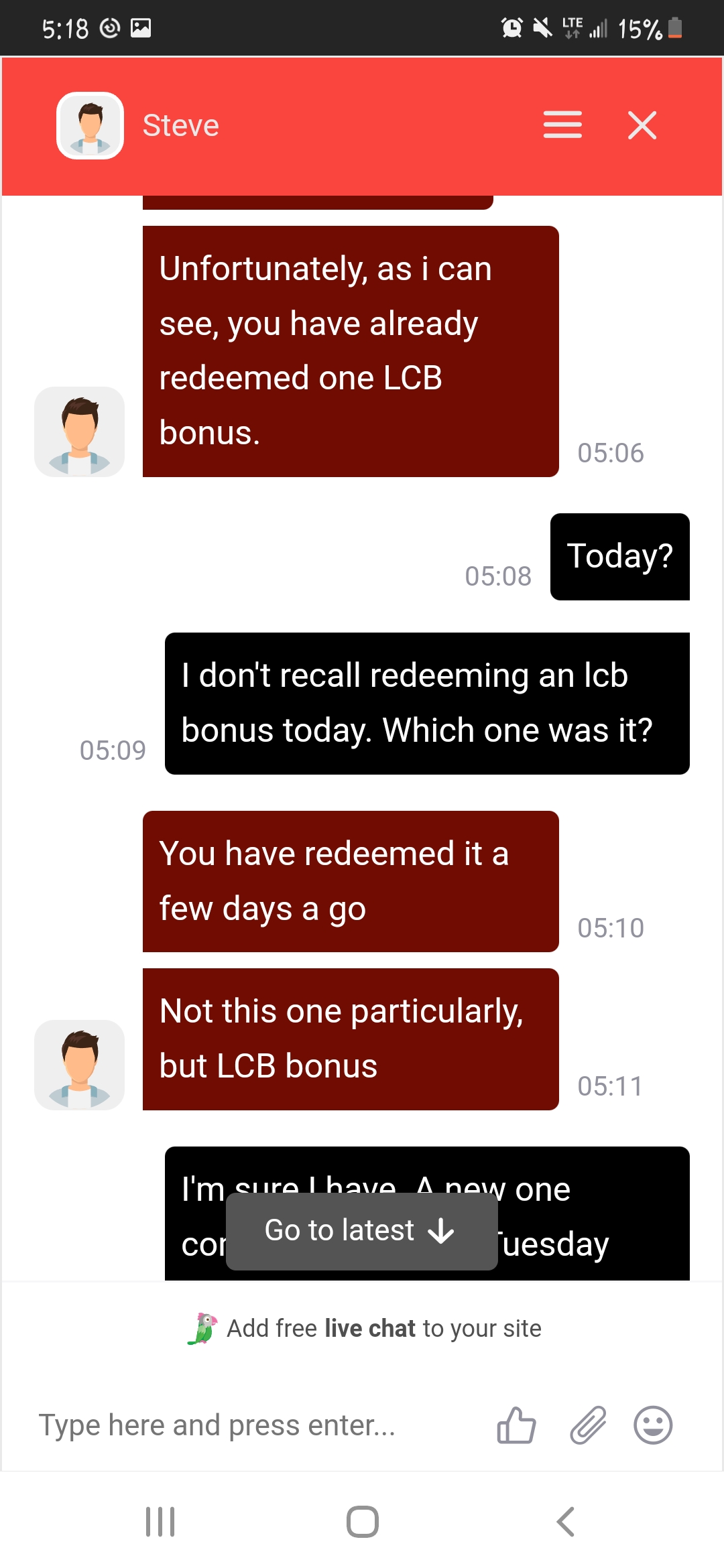 Ich habe versucht, den Bonus einzulösen, und es wurde mir angezeigt, dass meine Einzahlung nicht übereinstimmte. Ich habe heute über 30 $ eingezahlt. Ich kontaktierte den Support und erfuhr, dass ich nicht zwei LCB-Boni innerhalb weniger Tage einlösen konnte.