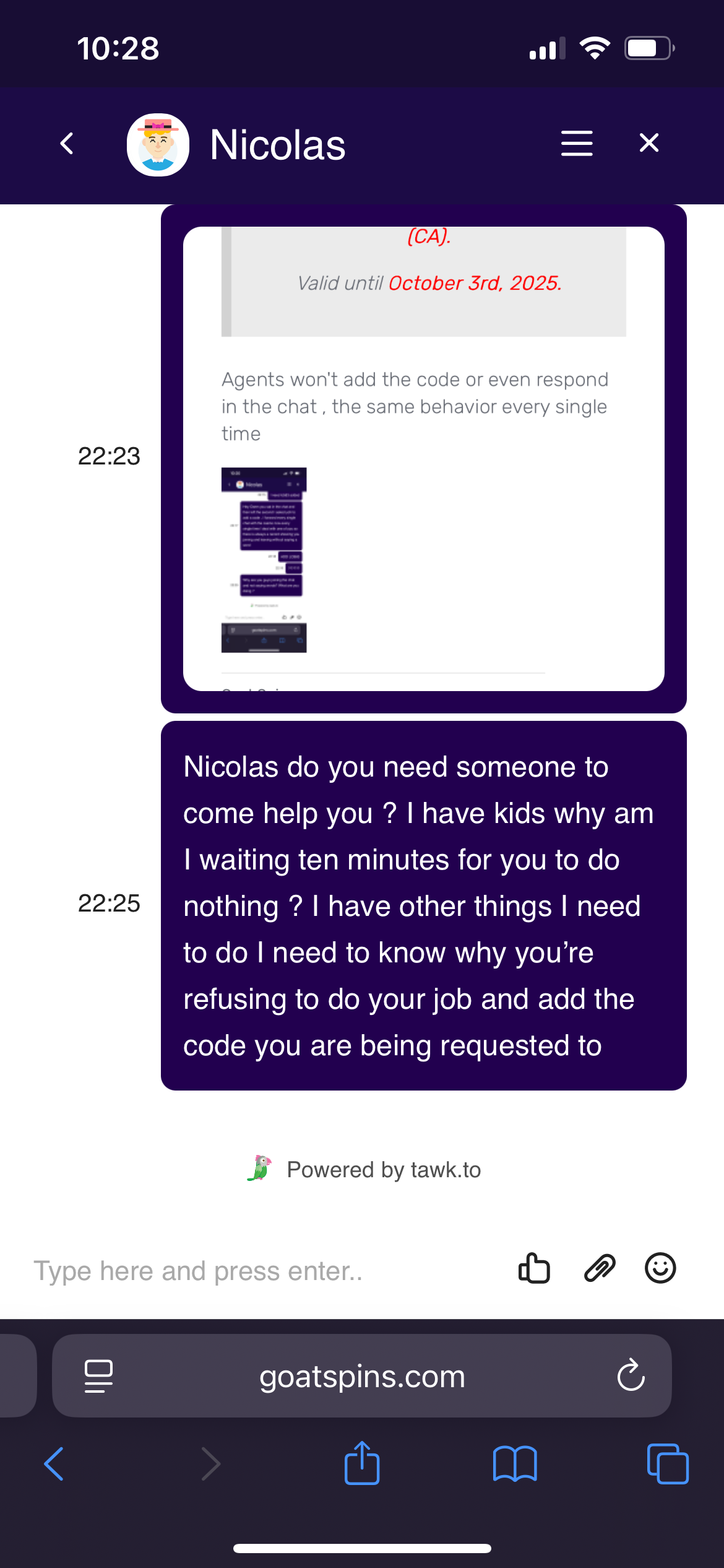 Tomm777 wrote:Sometimes if you ask support@goatspins.com nicely they might give you an extra spin