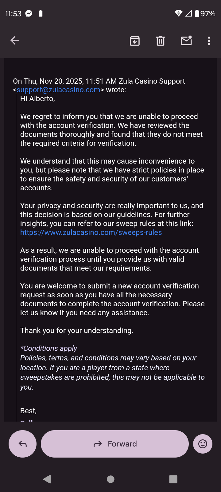 Hi iv been getting the run around for the verification iv submitted multiple documents to redeem 50$ iv won & the continue to come up with issues the 1st time I completed it the told me to resubmit id because of unclear pics so I ended up doing so which took me about 20 times to even pass n again it happened so & now the 3rd time after about a 100 times resubmiting documents to even pass it ther saying to do it again because of sum technical issue which took me to email them after the 7th day of waitingfor them to review it:( I tried asking why but the sent emails repeating themselves. Its frustrating it's been months of me trying to redeem i surely believe they r intentionally doing this :(