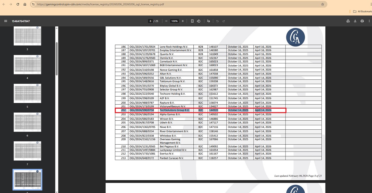 Offizielle Aufzeichnungen der Glücksspielbehörde von Curaçao bestätigen, dass die Lizenznummer OGL/2024/590/0758 auf die TechSolutions Group NV registriert ist.