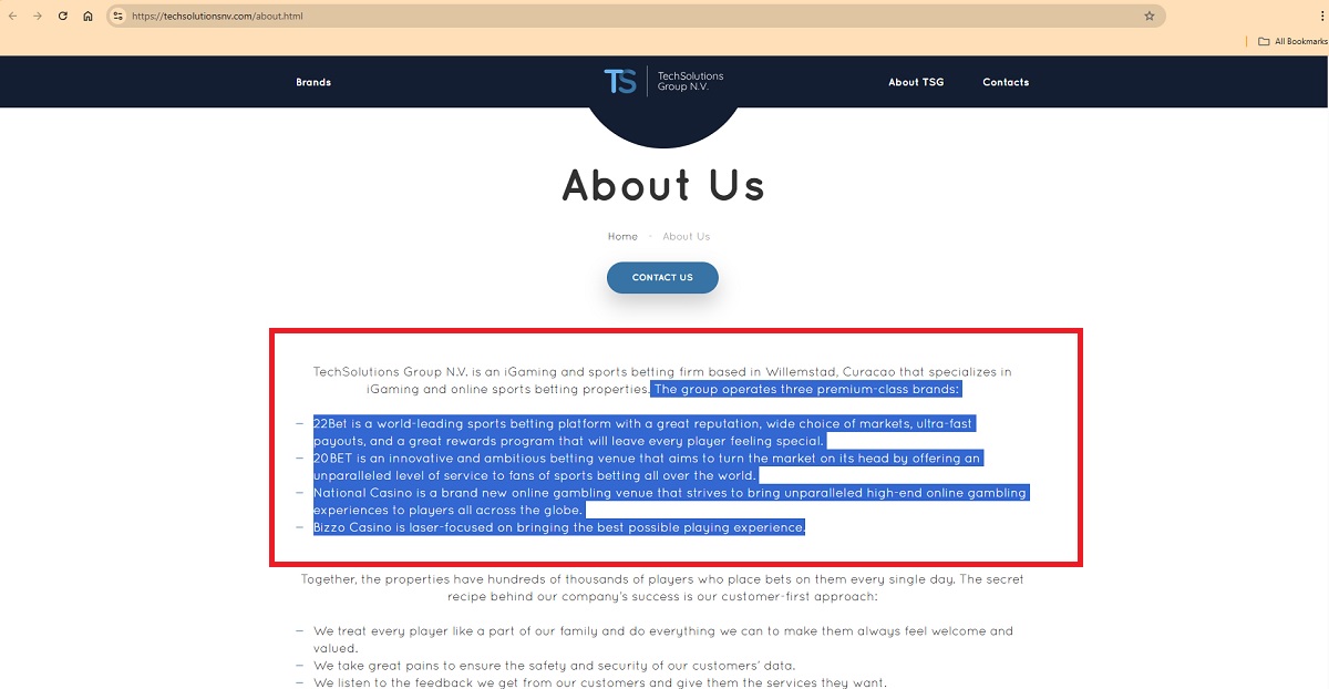The website nvcasino77.net falsely presents itself as being owned and operated by TechSolutions Group N.V. The betpoint.cc website is not part of TechSolutions Group N.V.