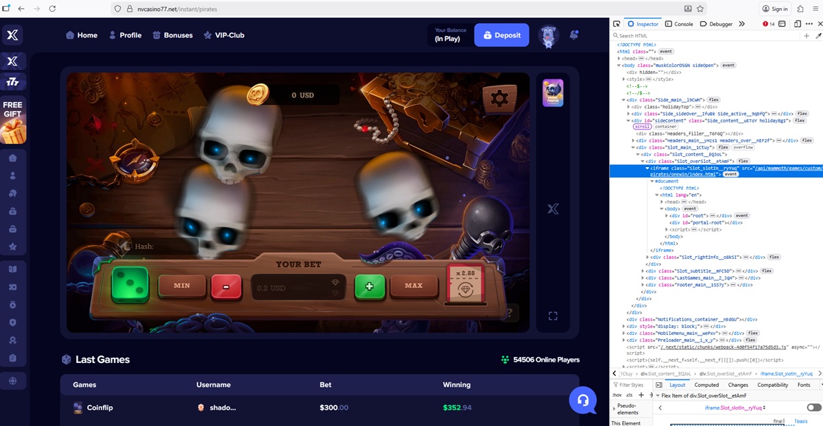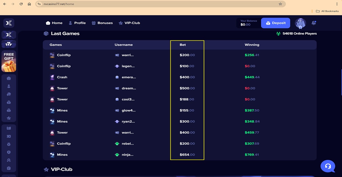 Die Casino-Plattform zeigt eine Liste der letzten Einsätze und Gewinne mutmaßlicher Spieler an. Die angezeigten Beträge umfassen ungewöhnlich hohe Einsätze und häufige hohe Gewinne, die nicht dem üblichen Spielverhalten und den üblichen Spielmustern entsprechen.