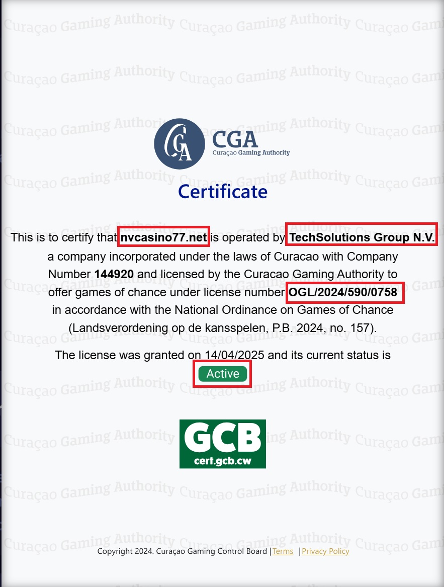 Das Dokument wurde veröffentlicht auf Auf der Webseite nvcasino77.net wird die TechSolutions Group NV (Firmenregistrierungsnummer 144920) als Lizenzinhaber aufgeführt und auf die Lizenznummer OGL/2024/590/0758 verwiesen. Es wird angegeben, dass die Lizenz am 14.04.2025 ausgestellt wurde und ihr aktueller Status AKTIV ist.