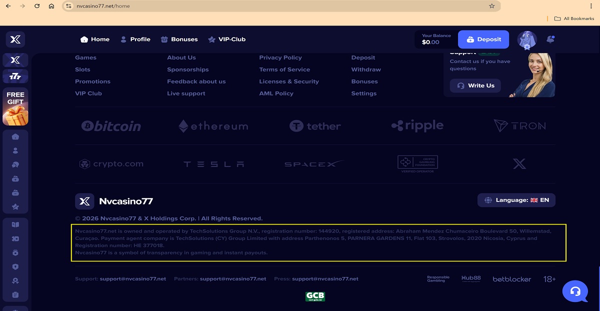 "nvcasino77.net is owned and operated by TechSolutions Group N.V., registration number: 144920, registered address: Abraham Mendez Chumaceiro Boulevard 50, Willemstad, Curaçao. Payment agent company is TechSolutions (CY) Group Limited with address Parthenonos 5, PARNERA GARDENS 11, Flat 103, Strovolos, 2020 Nicosia, Cyprus, and Registration number: HE 377018."