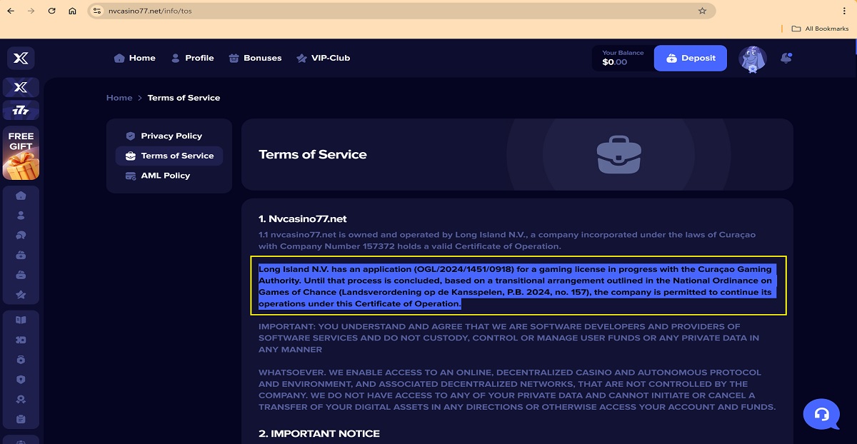 ➡️ Conclusion: The information presented across nvcasino77.net's website demonstrates clear misuse and misrepresentation of licensing details. Multiple entities are inconsistently identified as the operator, and license numbers are either revoked, expired, or attributed to companies that are not the actual operators.