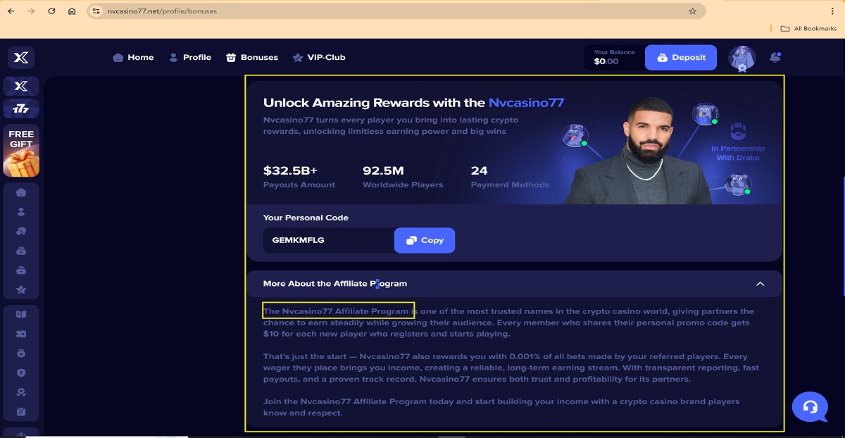 Based on the available public information, there is no verifiable evidence that a legitimate iGaming or crypto casino affiliate program operated under the name “Nvcasino77 Affiliate Program” currently exists. The claims describing a Nvcasino77 Affiliate Program — including guaranteed payments of $10 per registered player, ongoing earnings of 0.001% of all bets, and references to transparent accounting and fast payouts — cannot be substantiated through reliable or industry-recognized sources.