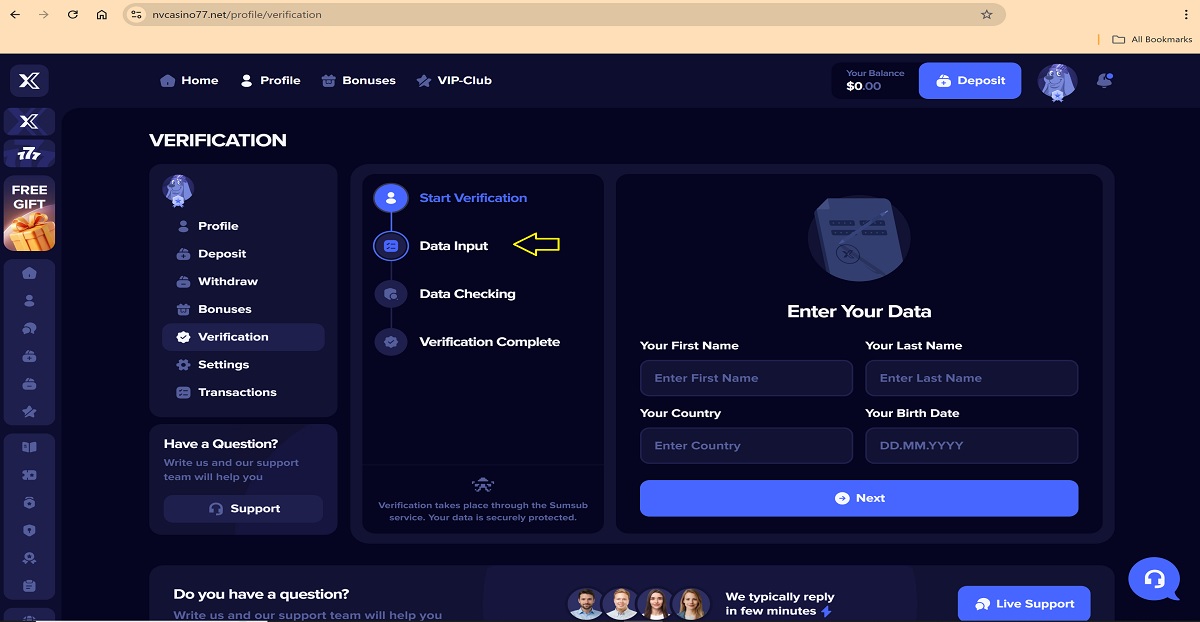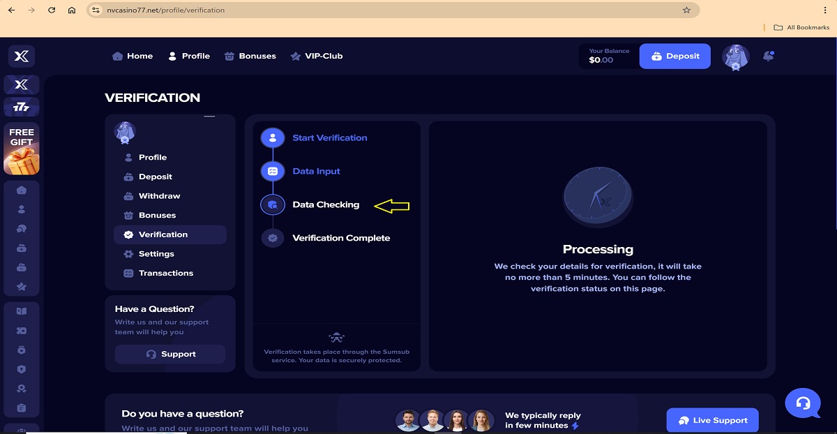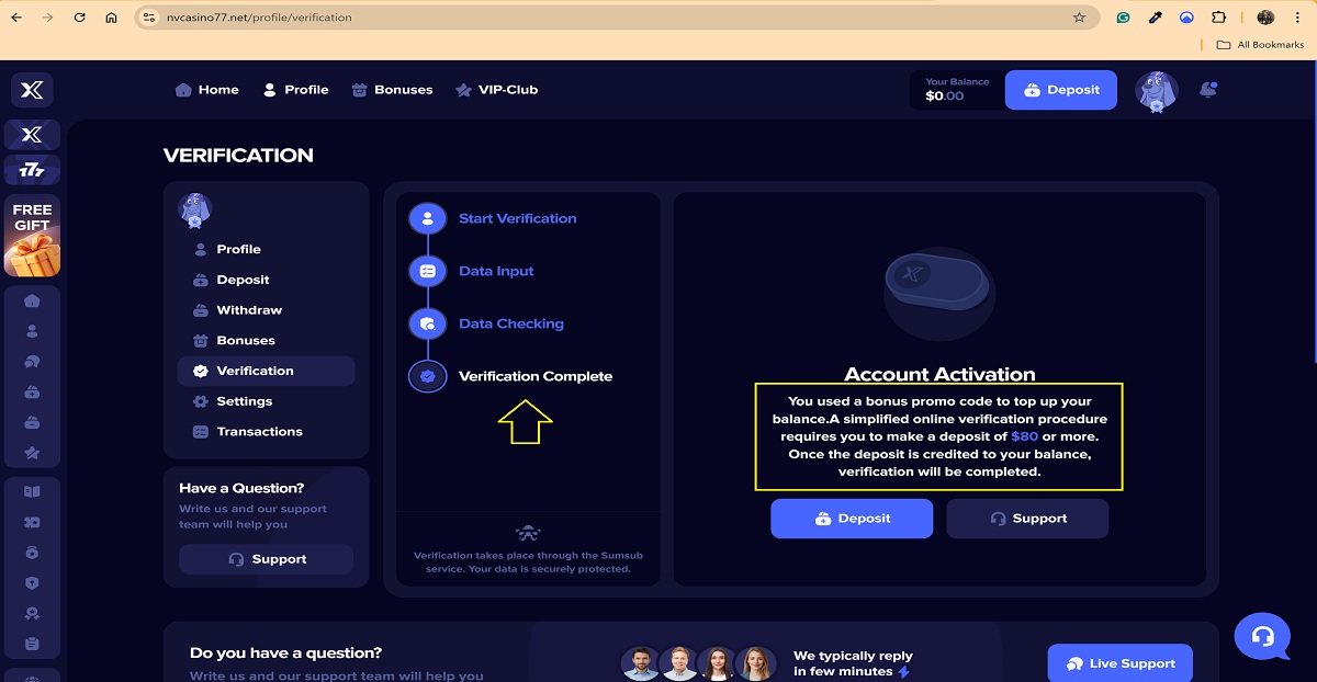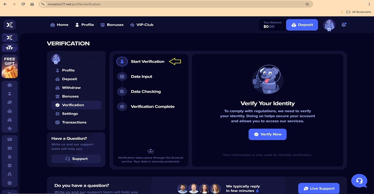 The alleged player account verification process on nvcasino77.net represents a key scam pattern commonly used by fraudulent “casinos” to deceive players. When accessing their profile under the Verification tab, players are presented with a four-step process that is portrayed as a legitimate account verification procedure.