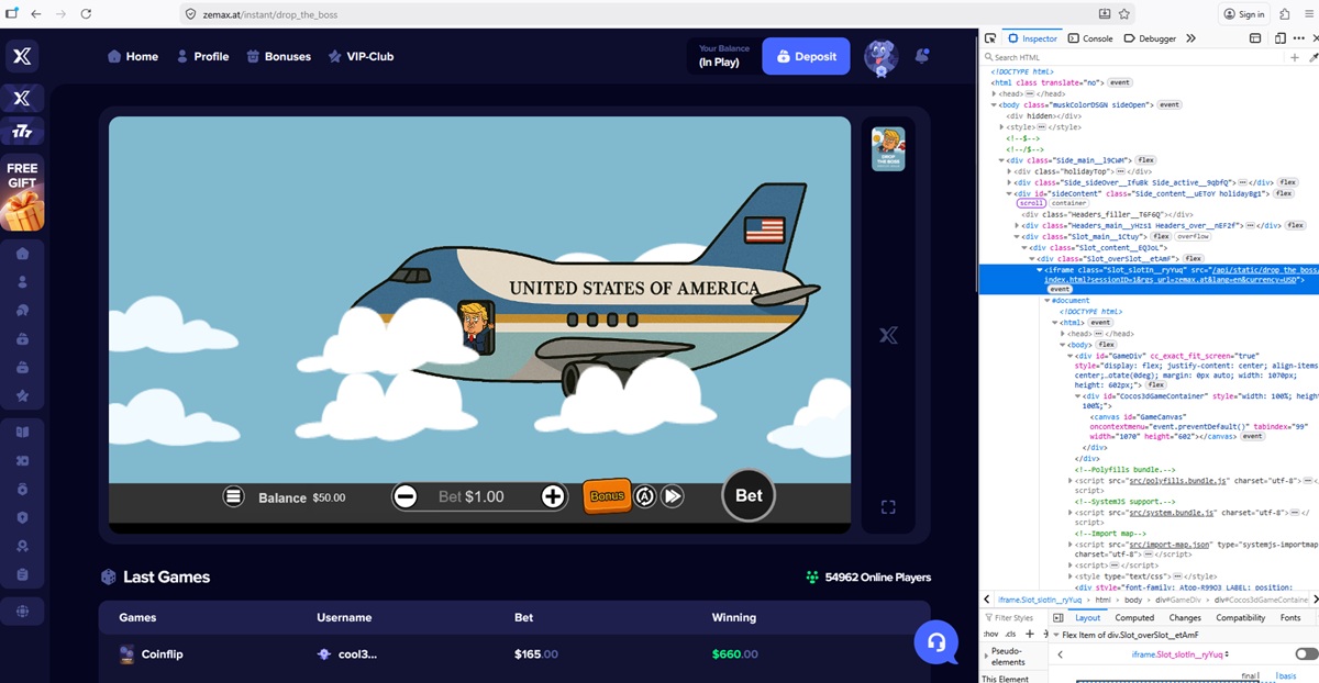 Die Casino-Plattform zeigt eine Liste der letzten Einsätze und Gewinne mutmaßlicher Spieler an. Die angezeigten Beträge umfassen ungewöhnlich hohe Einsätze und häufige hohe Gewinne, die nicht mit realistischem Spielerverhalten und üblichen Spielmustern übereinstimmen.