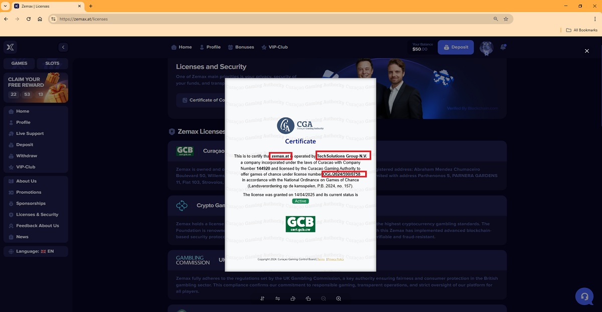Offizielle Aufzeichnungen der Glücksspielbehörde von Curaçao bestätigen, dass die Lizenznummer OGL/2024/590/0758 auf die TechSolutions Group NV registriert ist.