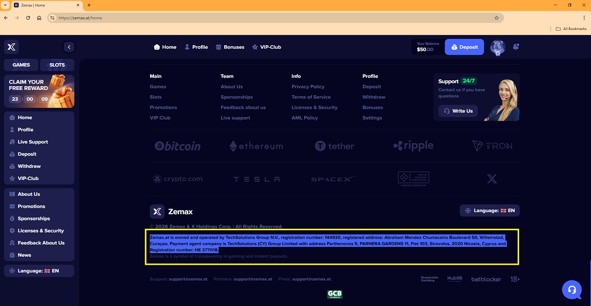 "zemax.at is owned and operated by TechSolutions Group N.V., registration number: 144920, registered address: Abraham Mendez Chumaceiro Boulevard 50, Willemstad, Curaçao. Payment agent company is TechSolutions (CY) Group Limited with address Parthenonos 5, PARNERA GARDENS 11, Flat 103, Strovolos, 2020 Nicosia, Cyprus and Registration number: HE 377018."
