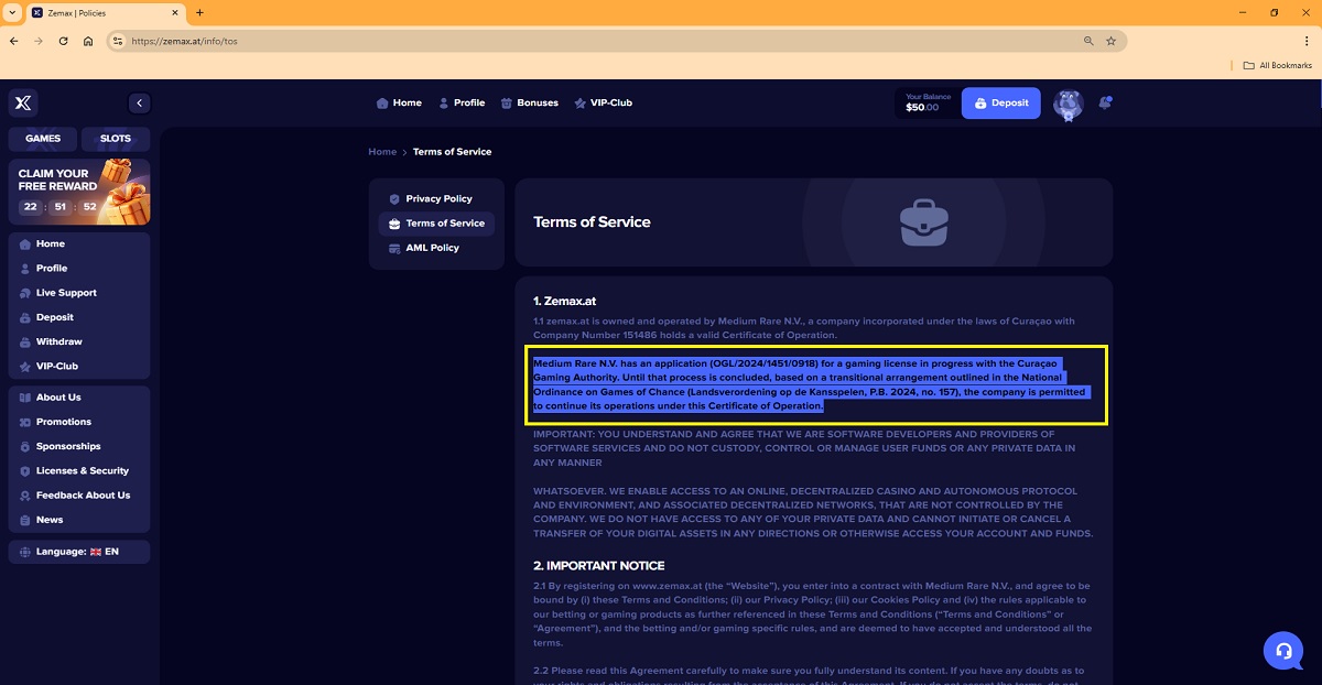 Laut der offiziellen Website der Curaçao Gaming Authority (CGA) gehört die Lizenznummer OGL/2024/1451/0918 einem anderen Unternehmen, nämlich Medium Rare NV (Handelsregisternummer 145353). Die Lizenz wurde am 9. Juni 2025 ausgestellt und lief am 9. Dezember 2025 ab.