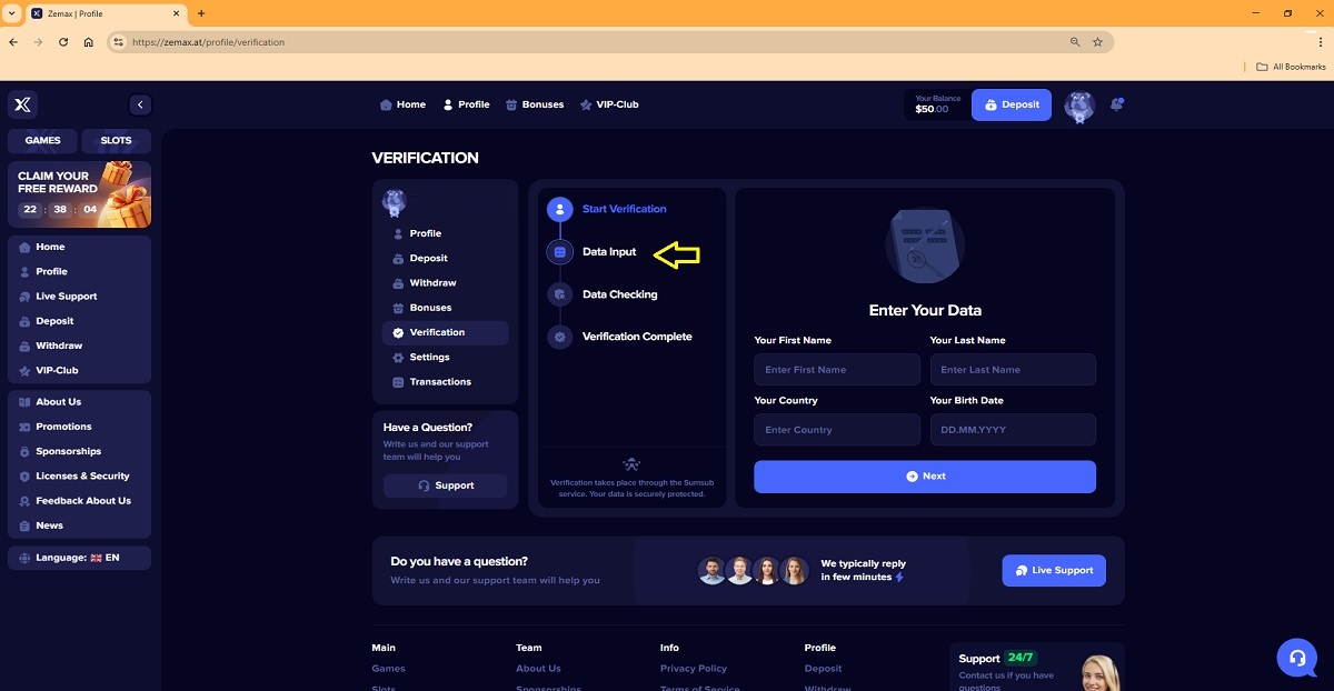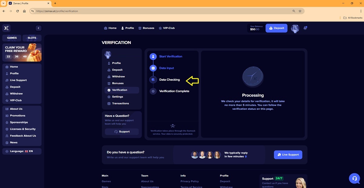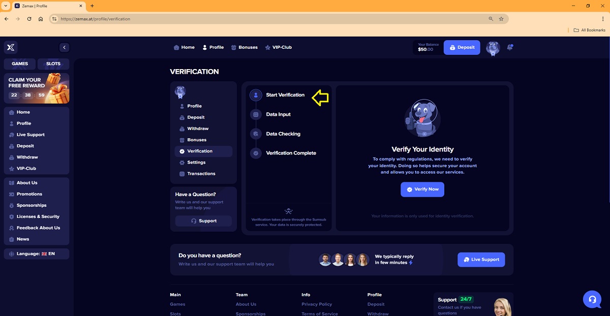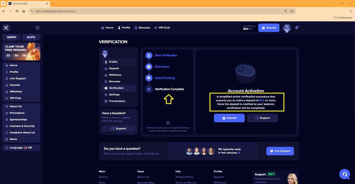 The alleged player account verification process on zemax.at represents a key scam pattern commonly used by fraudulent “casinos” to deceive players. When accessing their profile under the Verification tab, players are presented with a four-step process that is portrayed as a legitimate account verification procedure.