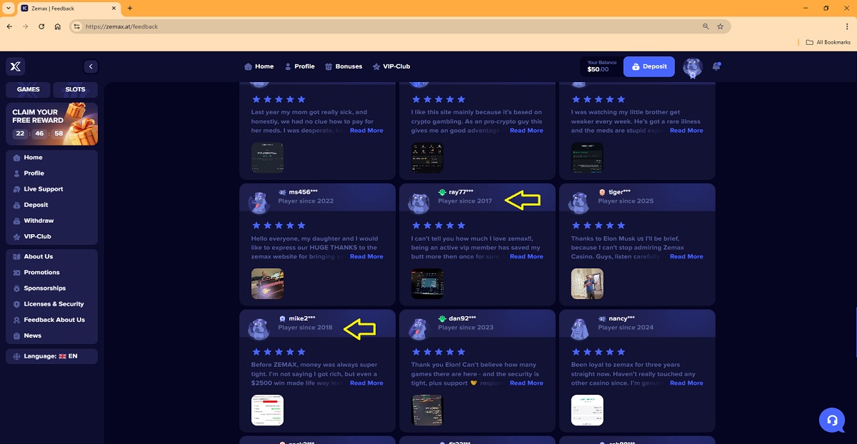 On the website’s Feedback page, only positive 5-star reviews are displayed. Some of these reviews claim to be from players who have been members since 2017, even though the zemax.at domain was registered only recently, on 06.02.2026.