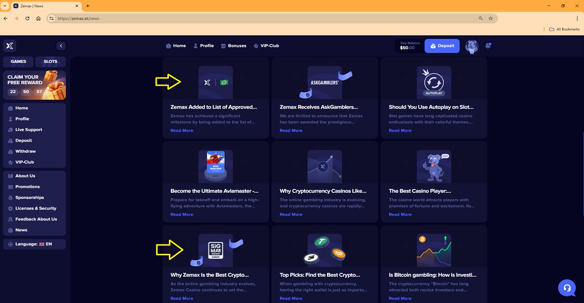 Alle auf der Newsseite der Website veröffentlichten Artikel enthalten falsche oder irreführende Behauptungen. Sie scheinen mit der Absicht verfasst worden zu sein, Spieler zu täuschen und den Eindruck zu erwecken, die Website sei ein seriöser und regulierter Casino-Betreiber.